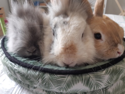 Nougatine, Archie et Flocon lapines naines. Pop est un lapin angora.